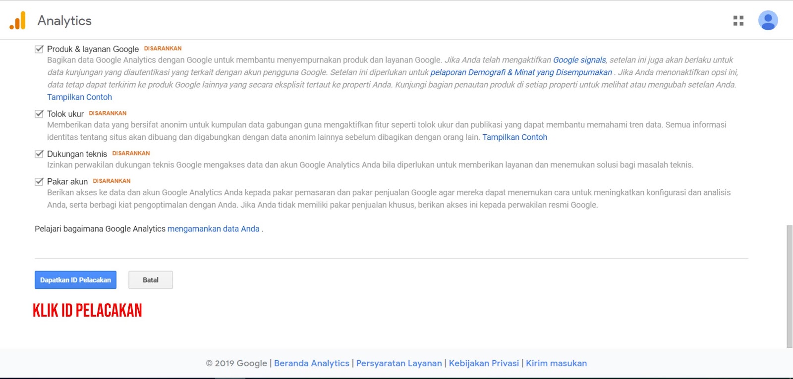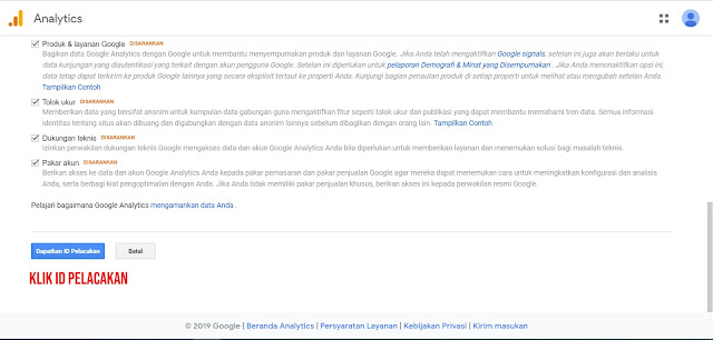 4. Setelah scroll pada akhir form, temen temen akan menemui "DAPATKAN ID PELACAKAN", klik Id Pelacakan tersebut untuk memunculkan TOS penggunaan Google Ananlitycs