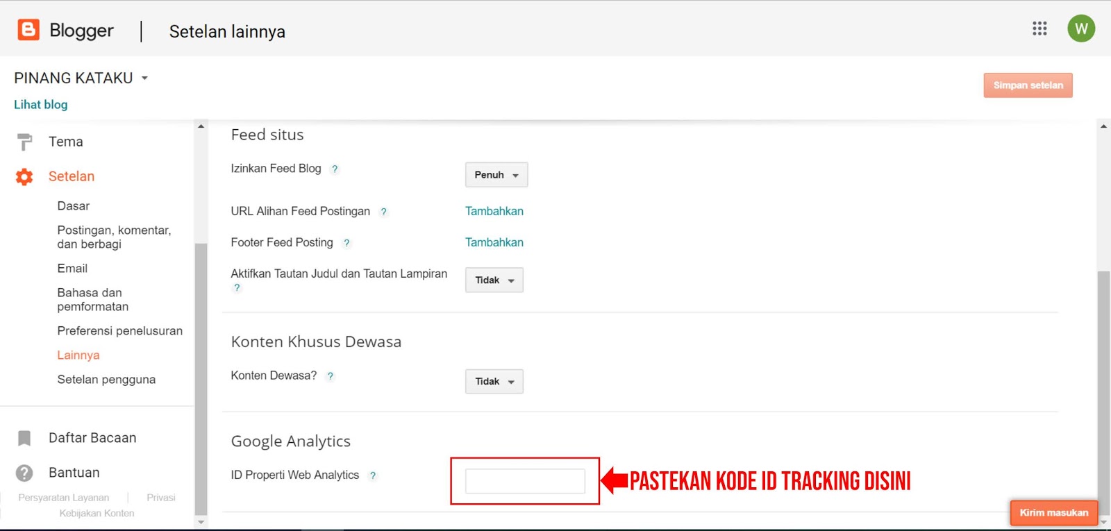 7. Masuk kembali kedalam blog yang kamu gunakan lalu pilih SETELAN --- LAINNYA , dan lihat pada bagian paling bawah ada kolom " ID PROPERTY WEB ANALITYCS " isi dengan copy ID PELACAKAN secara penuh.