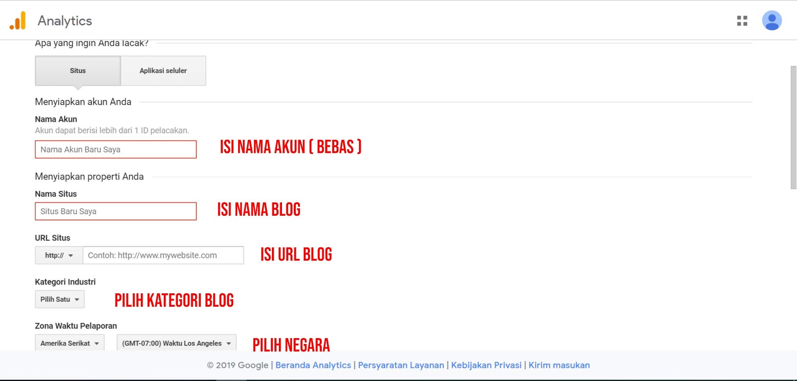 3. Pilih "SITUS" karena yang akan kita analisa adalah situs blog yang kamu daftarkan, namun apabila ingin menganalisa mengenai aplikasi. Kamu bisa memilih pada kolom "APLIKASI SELULER"