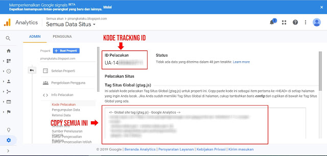6. Setelah mencentang TOS yang keluar tadi, maka akan muncul Kode "ID PELACAKAN" itu adalah kode tracking ID blog temen temen. Pada kolom di bawahnya adalah "TAG SITUS GLOBAL" yang nanti akan kamu copy lalu di letakkan di atas <HEAD> pada bagian Tema, Edit HTML di bagian Blog Teman teman
