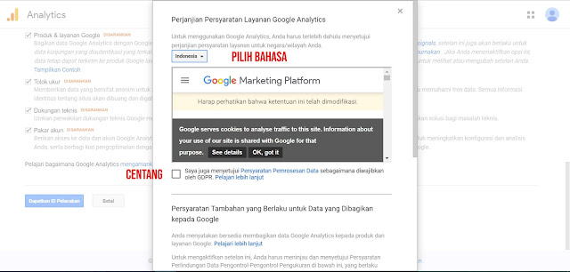5. Pilih Bahasa yang kamu gunakan, lalu centang menyetujui persayaratan penggunaan yang di ajukan oleh Google Analitycs